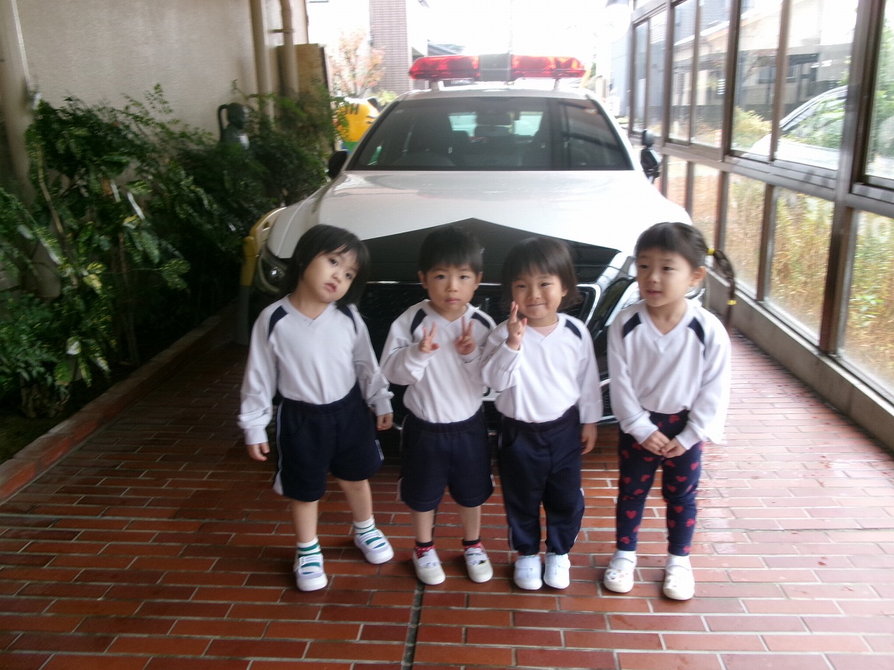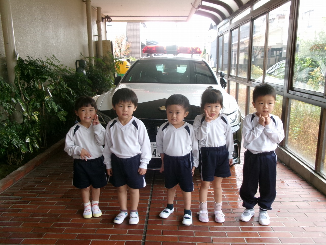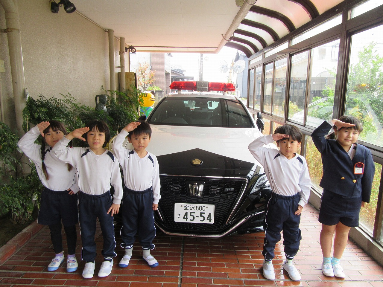 11/26(水)金沢東警察署より指導員の方が来園され、交通安全教室がありました。指導員の方のお話で「どうろへきゅうにとびださない」「どうろであそばない」「くるまにのったらチャイルドシート」の3つのお約束をしました。チャイルドシートの乗り方をぬいぐるみを使って実践してもらい、子ども達は真剣にお話を聞いていましたよ。横断歩道の渡り方も実際にやってみて手をしっかり挙げて渡っていました。その後は、パトカーを間近でみることができ大興奮!!パトカーの前でかっこいいポーズで記念撮影していました。これからも園外活動やお散歩、ご家庭でのお出かけの時でもしっかり守ってくれるように交通ルールを繰り返し伝えていきたと思います。