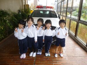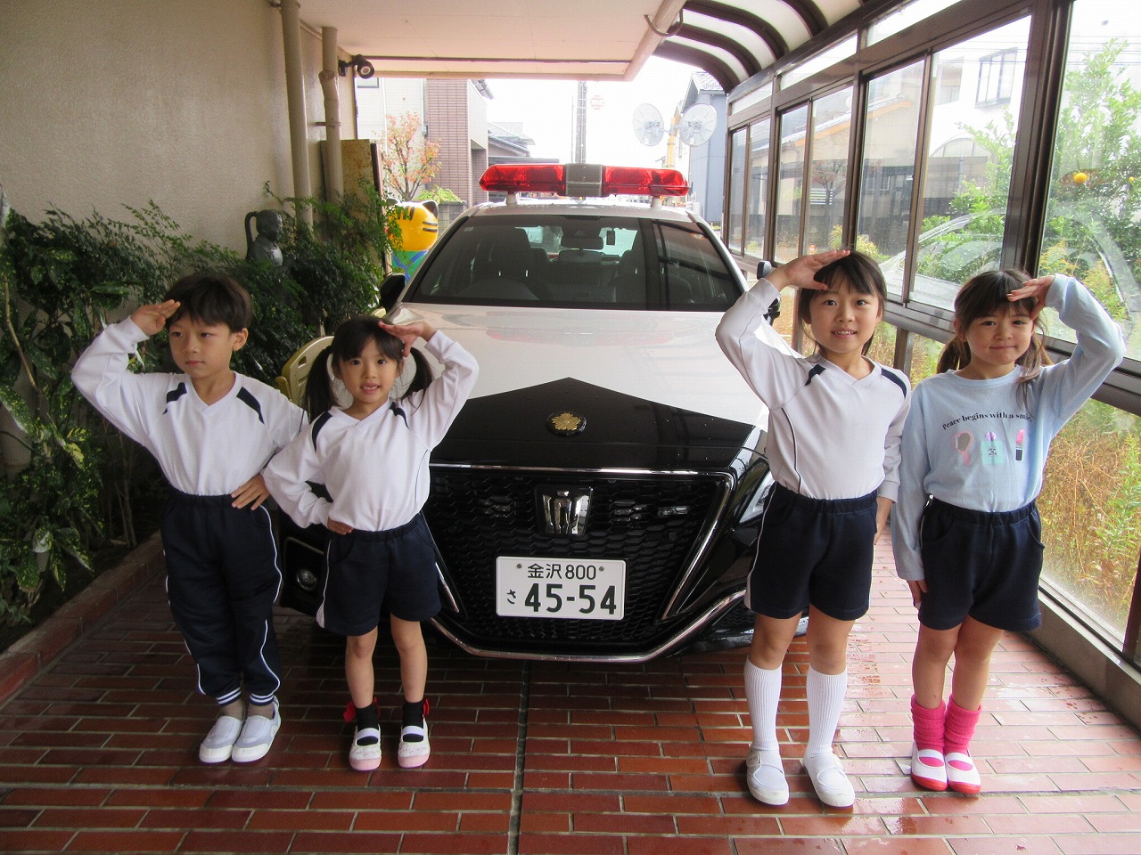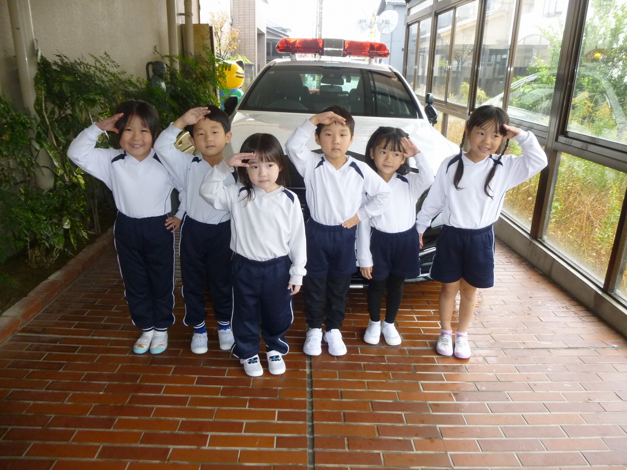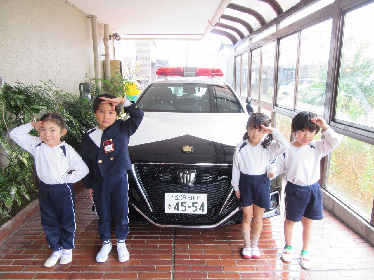 11/26(水)金沢東警察署より指導員の方が来園され、交通安全教室がありました。指導員の方のお話で「どうろへきゅうにとびださない」「どうろであそばない」「くるまにのったらチャイルドシート」の3つのお約束をしました。チャイルドシートの乗り方をぬいぐるみを使って実践してもらい、子ども達は真剣にお話を聞いていましたよ。横断歩道の渡り方も実際にやってみて手をしっかり挙げて渡っていました。その後は、パトカーを間近でみることができ大興奮!!パトカーの前でかっこいいポーズで記念撮影していました。これからも園外活動やお散歩、ご家庭でのお出かけの時でもしっかり守ってくれるように交通ルールを繰り返し伝えていきたと思います。