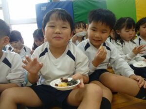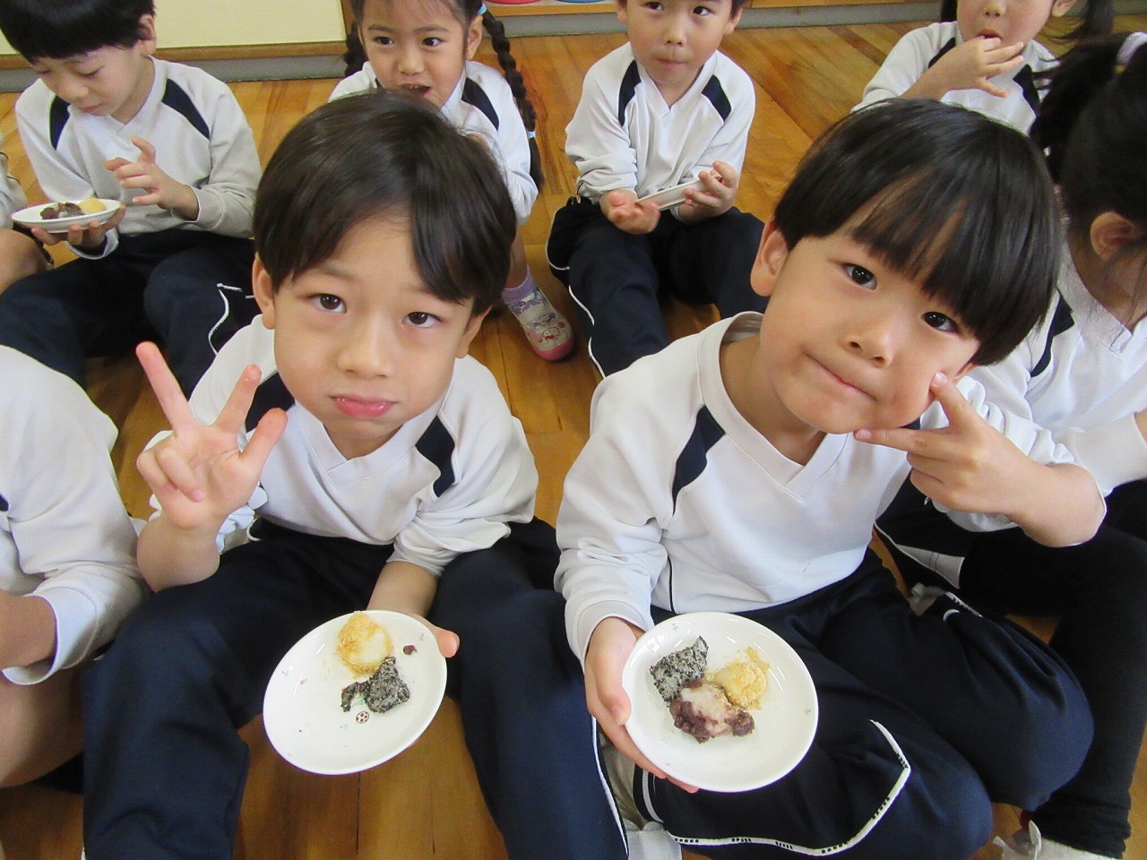 園長先生や調理さんをはじめ、先生方やはす組さんにも協力してもらい、おいしいお餅がつきあがりました。