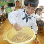 11月に栄養士さんから味噌になるまでの工程を教えていただきました。 「味噌って何から作られていると思う?」の質問に答えがわからない子ども達。「正解は大豆だよ。」と実際の大豆を見せてもらうと「えーーー!」と驚きの声が上がり […]